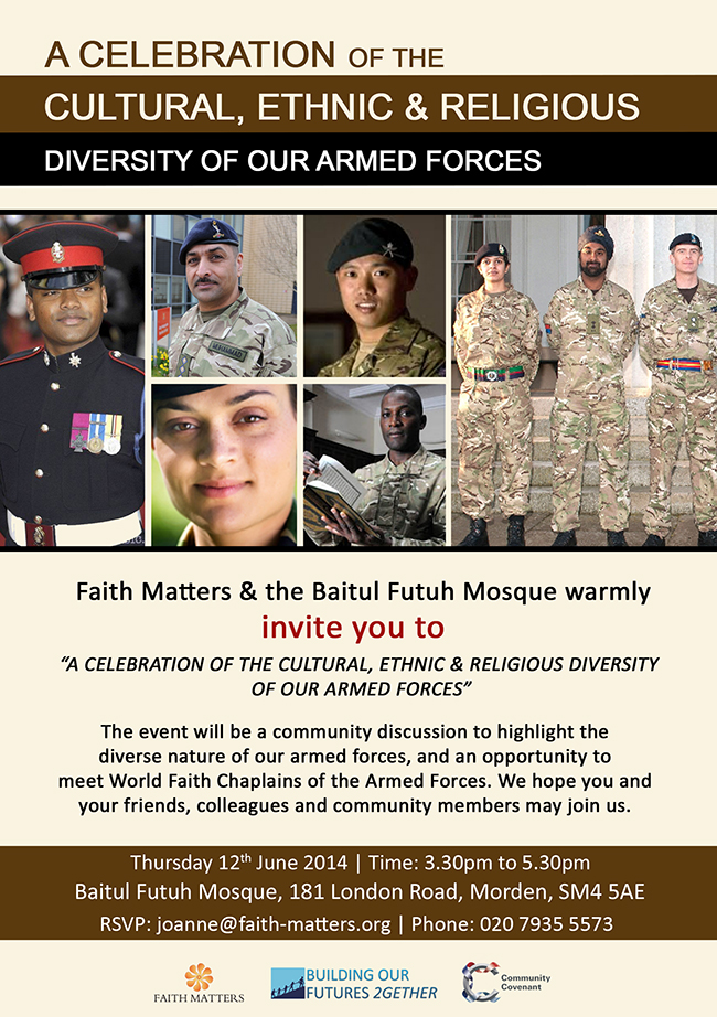 Join us at the Baitul Futuh Mosque in Morden around the ‘Celebration of the Cultural, Ethnic and Religious Diversity of Our Armed Forces.’ This will take place on the 12th of June, between 3:30 pm and 5:30 pm at the mosque and also present will be the Muslim chaplain to the Armed Forces and the Adviser on Muslim Communities to the Ministry of Defence.